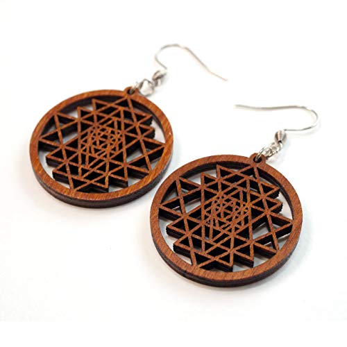 Circle Wooden Earrings Sri Yantra Mandala, 0g, 32 mm, Yoga Jewelry, Tantra Gifts, Spiritual Jewelry