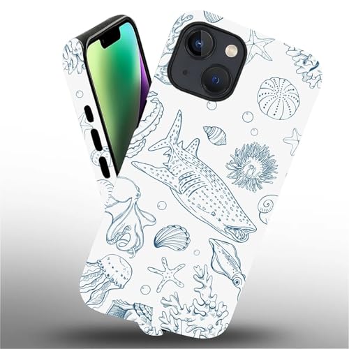 FKBRCL4U for iPhone 13/iPhone 14 Case, Hybrid 2-Layer Silicone Protective Matte Case for Girl Women Whale Shark Coral Reefs Seashell Starfish Pattern for iPhone 13/iPhone 14