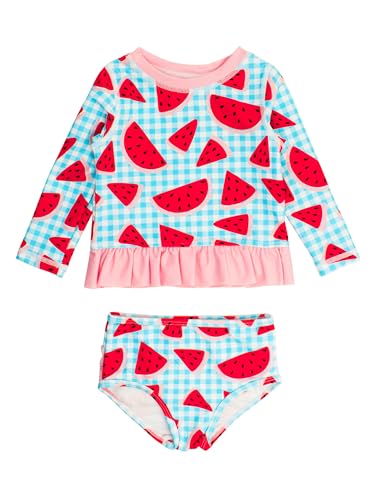 RuffleButts Baby/Toddler Girls Long Sleeve Rash Guard UPF50+ Sun Protected Bikini Swimsuit - Watermelon Gingham, 18-24m