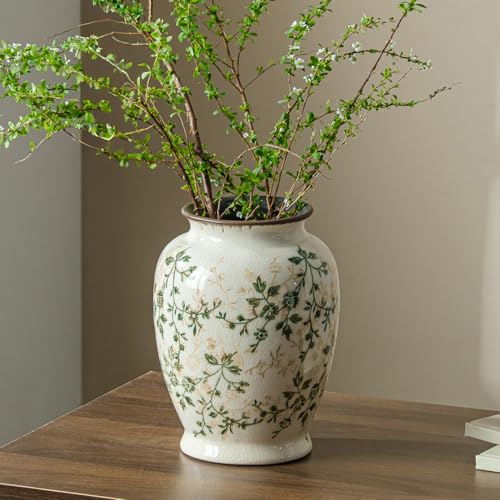 Vintage Green and Beige Vase, Round Ceramic Floral Vases, Retro Ice Cracked Chinoiserie Vase for Home Decor, Living Room, Bookshelf, Office, Grand Millennial Decor, Rustic Table Centerpiece 8 Inch