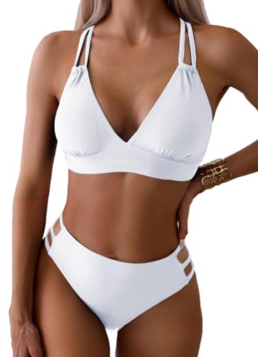 Fanuerg Women's V Neck Bikini Sets Hollow Out Push Up Swimsuit Criss Cross Back Two Piece Bathing Suit White XS