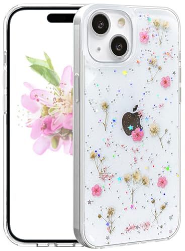 CEOKOK for iPhone 15 Case Clear Floral Pattern Design Real Pressed Dried Pink Flower Cute Glitter Sparkly Slim Soft TPU Protective Women Girl's Phone Cover (Pink)