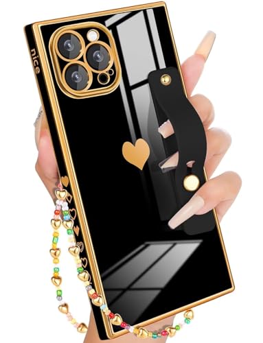 Petitian for iPhone 12 Pro Max Case with Stand/String, Luxury Cute Women Girls Heart Electroplated Designer Phone Cases for 12 Pro Max, Black