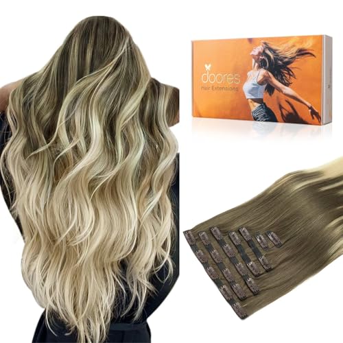 DOORES Remy Hair Extensions, Ash Brown to Platinum Blonde 16 Inch 110g 7pcs, Seamless Clip-in Hair Extensions with Natural Straight Hair and Invisi Edge