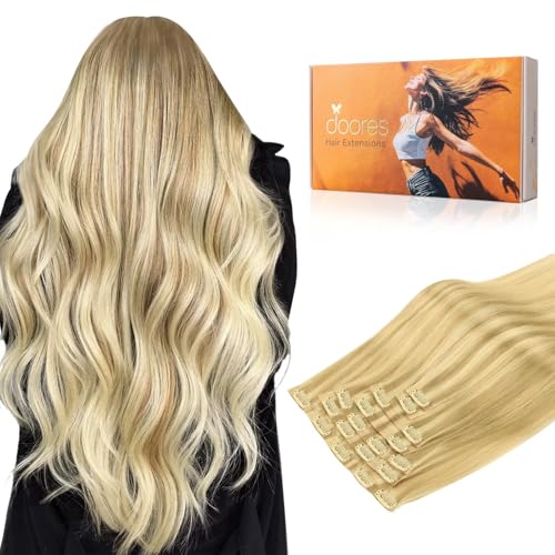 DOORES Hair Extensions Seamless Clip in Real Human Hair, Light Blonde Highlighted Golden Blonde 24 Inch 120g 7pcs, Human Hair Extensions Skin Weft Remy Straight Hair Invisi Edge Hair Extensions