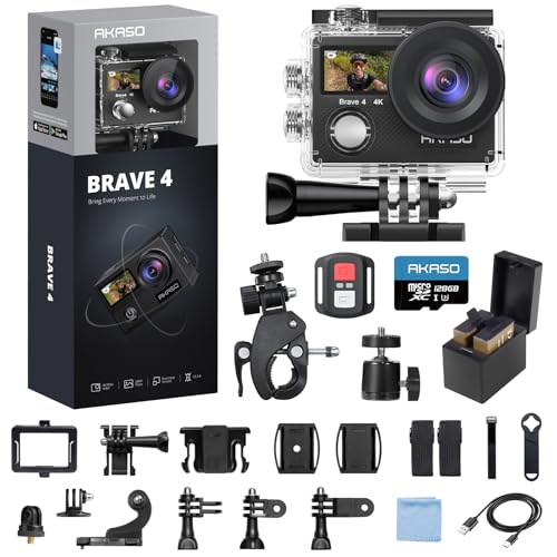 AKASO Brave 4 Action Camera 4K 30fps with 128GB MicroSDXC Card 20MP Ultra HD 131FT Waterproof Underwater Camera EIS WiFi Remote Control 5X Zoom Sport Cameras with Bicycle Accessories Kit Bundle