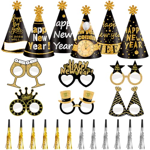 Openfly New Years Eve Party Supplies 2026, 24pcs New Years Party Hats Noise Makers & New Year 2025 Glasses for New Year Decorations Accessories Kit