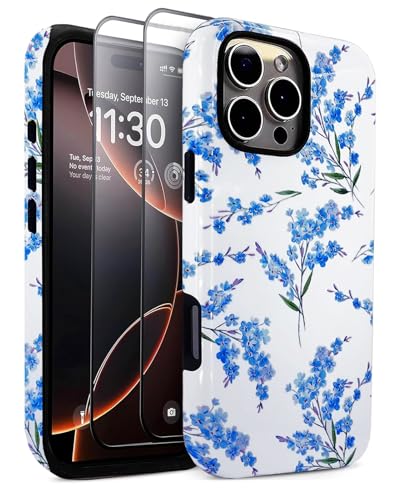 J.west for iPhone 16 Pro Case 6.3" with 2 Pack Tempered Glass Screen Protectors Cute Floral Flowers Hybrid Cover for Girls Women Aesthetic Protective Phone Cases Blue Blossom