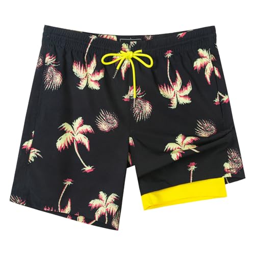 SURF CUZ Mens Swim Trunks with Compression Liner Quick Dry Swim Shorts 7" Swimming Trunks Stretch Bathing Suit Zipper Pockets,Neon Palms,XXL
