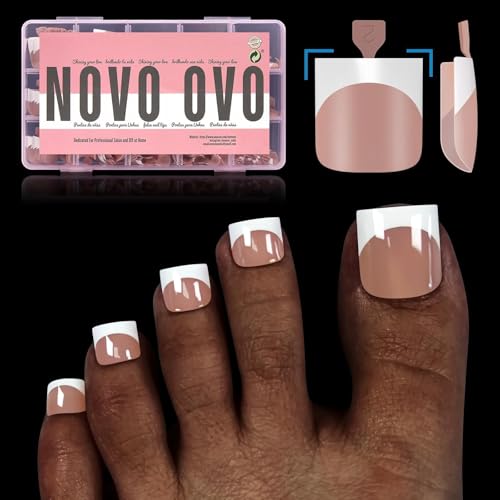 NOVO OVO French Tip Toe Nail Tips Press on, Sharp Square Pre-Designed Soft Gel False Toenail Extension, BROWN PINK Pre-applied Tip Primer & Base Coat, Full Cover Acrylic for DIY x 15 Sizes 240 pcs
