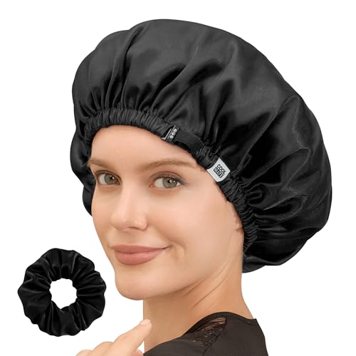CoolMate Adjustable Satin Silk Bonnet for Sleeping Women, Tie Double Lined Silk Bonnet for Women Long Hair (Black & Black)