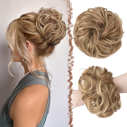 FESHFEN Messy Bun Hair Piece - Large Elastic Wavy Curly Hair Bun Scrunchies Ponytail Extensions Synthetic Chignon Hairpieces for Women, Light Brown & Mixed Blonde 1.94oz
