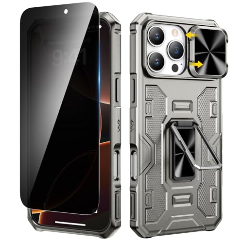 VEGO for iPhone 16 Pro Max Case with Camera Cover, 360°Rotatable Ring Kickstand & Privacy Screen Protector Upgraded Military Grade Shockproof Case for iPhone 16 ProMax 5G 6.9 Inch - Titanium
