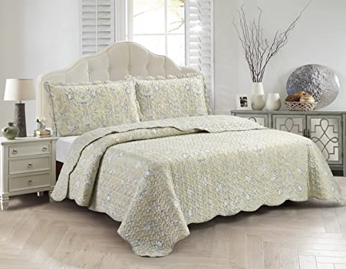 Brilliant Sunshine Classic Grey Floral Toile in Beige Background, 3-Piece Quilt Set with 2 Shams, Reversible Bedspread, Soft Lightweight Coverlet, All-Season, King, Beige