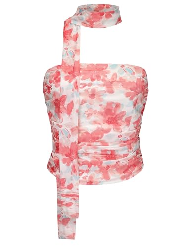 Women's Leopard Print Tube Top Cheetah Print Top Ruched Strapless Mesh Halter Tops for Women Going Out Party (Flower Orange, Medium)