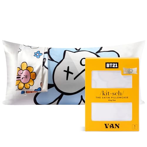 Kitsch x BT21 Satin Pillowcase with Zipper – Better Than Silk Pillowcase, Van Character & Funky Floral Print – Soft Cooling Toddler Bed Time Pillow Case for Hair & Skin – King Size 19x36
