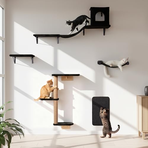 PELUOMOZ Wall Mounted Cat Furniture Combo of 5, 5 in 1 Cat Shelves with Hammock, Bridge, Climbing Tree, Scratcher & Perch – Indoor Wall Cat Playground for Large Cats, Holds Up to 30 lbs,