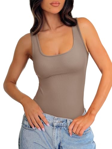 REORIA Body Suits Tank Top for Women Scoop Neck Sleeveless Ribbed Sexy Slimming Bodysuit Tops 2026 Summer Going Out Outfits Khaki Medium