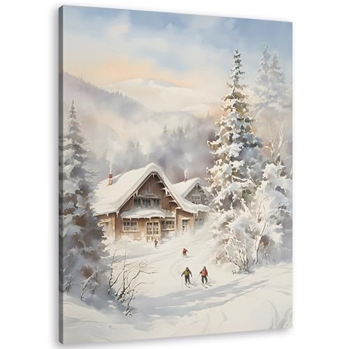 TLESKE Vintage Winter Ski Skiing Wall Art Decor, Snowy Woodland Forest Mountain Skiers Canvas Wall Art Print for Ski Lodge Bedroom Living Room, Rustic Christmas Ski Party Decorations Picture, 11x14