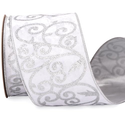 Ribbli White Velvet Ribbon Wired with Glitter Swirl 4 Inch Christmas Ribbon for Christmas Tree Decoration Big Bow Gift Wrapping Crafts Wreaths Supplies - 10 Yards