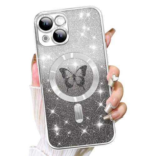 Fiyart Designed for iPhone 15 Case,Compatible with MagSafe Plating Camera Protection Butterflies Phone Cover, Magnetic Glitter for Women Girls Shockproof Bumper 6.1"-Silver