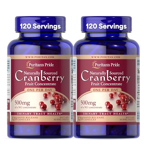 Puritan's Pride Naturally Sourced Cranberry One Per Day Fruit Concentrate 500mg, 50:1 Dietary Supplement for Urinary Tract Support, 4 Month Supply, 120 Rapid Release Capsules, 2 Pack