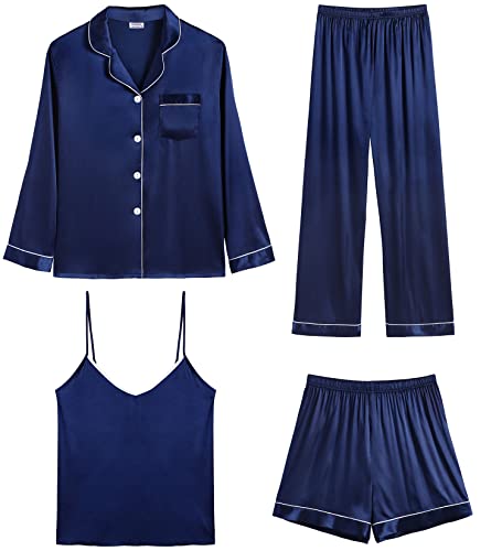 SWOMOG Womens 4pcs Pajamas Sets Silk Satin Pjs Sexy Cami Shorts Set Button Down Long Short Sleeve Sleepwear Loungewear(Long Sleeve, Navy Blue, XX-Large)