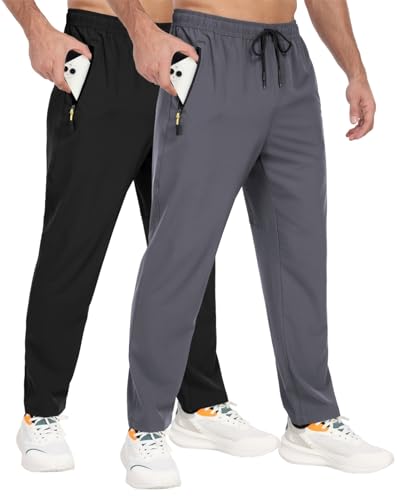 ZOOXING Mens Athletic Pants Lightweight Quick Dry Workout Hiking Exercise Pants Water Resistant Polyester Elastic Waist Sweatpants with Zipper Pockets 2-Pack Black-Darkgrey-XXXL
