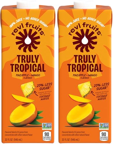 Revl Fruits 100% Juice, No Added Sugar, Pineapple Mango, Truly Tropical, 32 fl oz. Carton (Pack of 2)