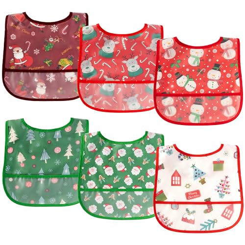 2ooya Christmas Baby Feeding Bib - 6Pcs Toddler Waterproof Food Bibs with Crumb Catcher Pocket Xmas Infant Adjustable Sleeveless Baby Bib First Christmas Gift for Eating Teething Drooling, 6-24 Months