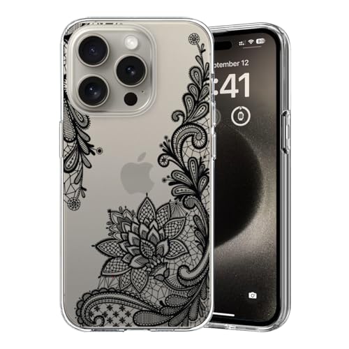 KEXAAR Designed for iPhone 15 Pro Max Case, Cute Case with Flowers, for Girls Woman, Black Lace Floral Design Pattern Hard Back Soft Bumper Shockproof Phone Case 6.7 inch 2023(Black Floral15px)