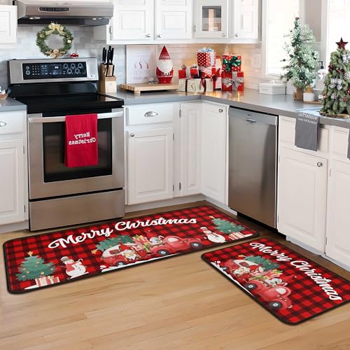 Buffalo Plaid Red Truck Christmas Kitchen Rugs 2 PCS, Merry Christmas Kitchen Rug, Non Skid Washable Soft Comfort Kitchen Rugs Set (17"x47"+17"x30",Merry Christmas)