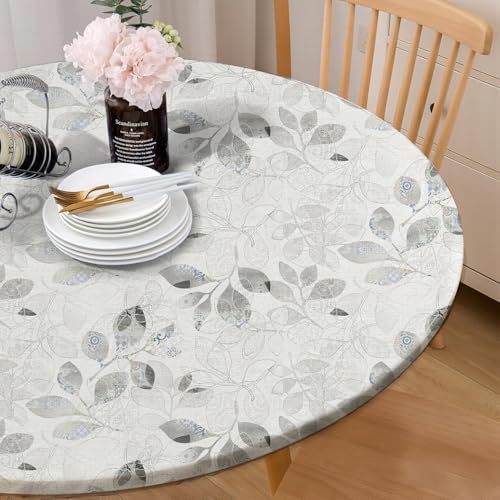 COKCOKR Round Tablecloth Fitted Elastic Edge Patio Table Covers Wrinkle Resistant Polyester Table Cloth for Picnic Camping Indoor and Outdoor,Retro Leaf Geometric Texture 57"-68"