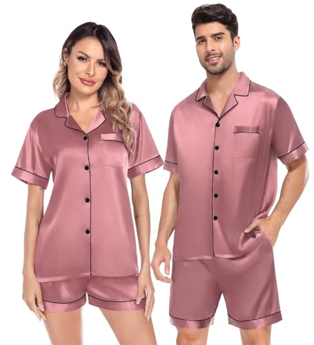 SWOMOG Satin Matching Pajamas Sets Couple Silk Button Down Nightwear Men & Women Short Sleeve Sleepwear 2 Pieces Loungewear Misty Rose