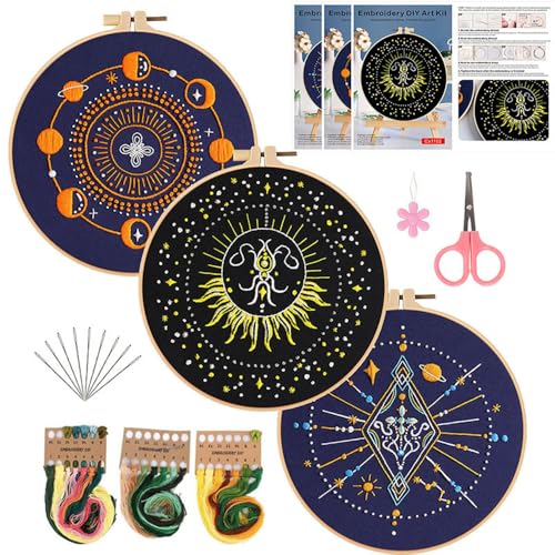 Konrisa 3 Pcs Stamped Embroidery Starter Kit for Adults Beginners, Universe Planet Pattern Cross Stitch Kits, DIY Sewing Practice Kit, Needlepoint Kits Include 1pcs Hoops, Hanging Decoration for Home