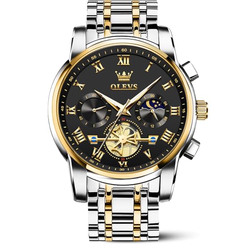 OLEVS Black Watches for Men Luxury Fashion Gold and Silver Stainless Steel Men's Wrist Watches Classic Nice Big Face Waterproof Quartz Men Watch with Day Two Tone Moon Phase Relojes para Hombres