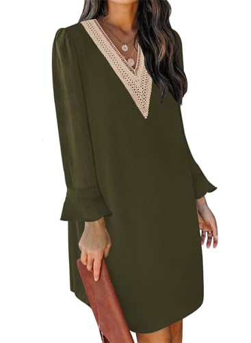 QACOHU Women's V-Neck Long Sleeve Mini Dress Ruffle Puff Sleeves Solid Color Tunic Dress Green XL Christmas Dresses for Women