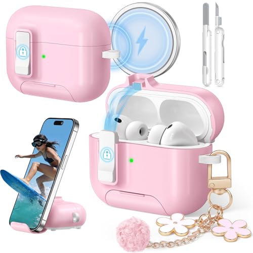 Ensfomte for AirPods Pro 3 Case (2025) with Cute Keychain, Secure Lock Case Cover for Apple AirPods Pro 3rd Generation with Phone Stand & Cleaning Kit for Women Girls, Compatible with MagSafe, Pink