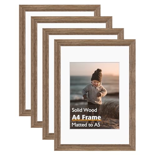KINLINK A4 Picture Frame, Brown Solid Wood Frames with Acrylic Plexiglass for Pictures A5 with Mat or A4 without Mat, Tabletop and Wall Mounting Display 4 Pack