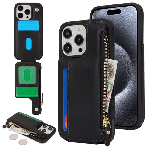 Cavor for iPhone 15 Pro Case with Card Holder,for iPhone 15 Pro Wallet Case for Women,Leather Zipper Pocket Shockproof Protective Phone Cover-Black