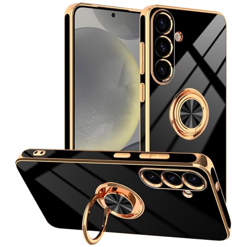 Tnarru Designed for Samsung Galaxy S25 Case with Ring Stand, Support Magnetic Car Mount Rotatable Finger Holder Soft TPU Cover Plating Edge Protective Slim Phone Case for Galaxy S25 Black