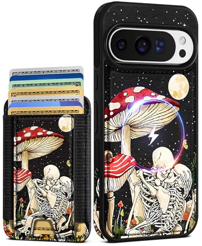 Shorogyt for Google Pixel 9Pro XL Cute Kawaii Leather Phone Case - Compatible with Magsafe Wallet Magnetic Credit Card Holder Fashion Mushroom Skull Design Phone Cover for Women Girls, Fits 7 Cards