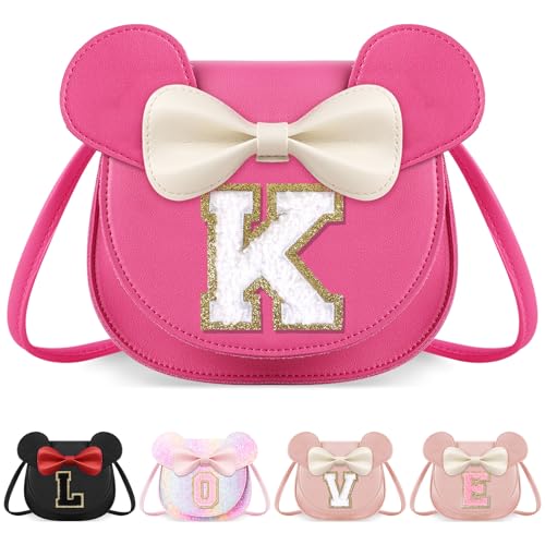 Little Girl's Birthday Purse - Cute Rose Mouse Ear Bow Crossbody Bag, Personalized Initial Glitter Letter Coin Purse(Large, Rose K)
