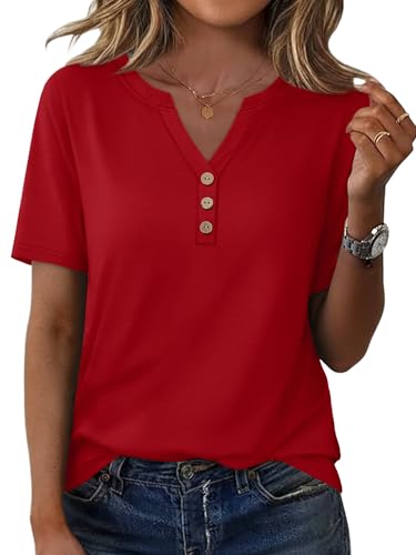Short Sleeve Shirts for Women Loose Fit V Neck Henley Tshirts Shirts Cute Summer Tops for Women Blouses Plus Size Spring Clothes Red XXL