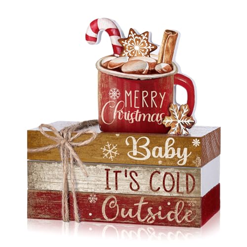 Anglechic 4 Pcs Christmas Table Decor Wooden Hot Cocoa Decoration Christmas Centerpiece Winter Tiered Tray Decor Decorative Red Hot Cocoa Block Signs Gift Farmhouse Xmas Decoration for Home Kitchen