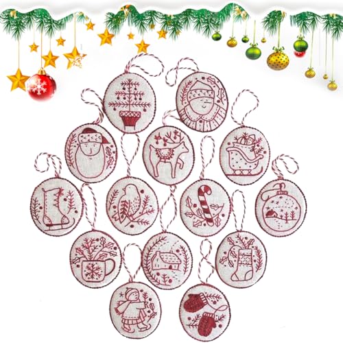 Zsdios Christmas Embroidery Kit,Embroidery Christmas Ornament Kits, Complete Needlepoint Starter Set, Hand Embroidery Ornament Kit for Beginners with Easy & Instructions (14 Pcs Red Set)