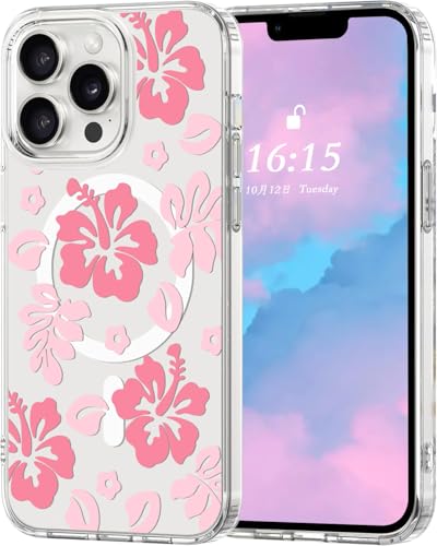 Houdqklee Magnetic Hibiscus Floral Case Cover for iPhone 16 Pro, Cute Girly Pink Hibiscus Flower Phone Case Compatible with MagSafe, Clear Soft Slim Shockproof Protective Case for Women Girls