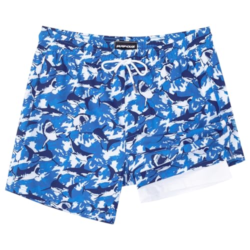SURF CUZ Mens Swim Trunks with Compression Liner 5" Swim Shorts Quick Dry Bathing Suit Swimming Trunks Zipper Pockets Blue Megalodon Large