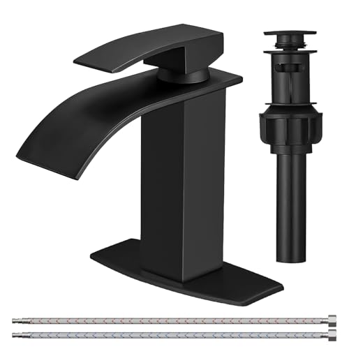 BESy Black Waterfall Bathroom Faucet, Single Hole 1 Hole 3 Holes Single Handle Bathroom Sink Faucet, Vanity Faucet with 6 Inch Deck Plate, cUPC Waterlines, Matte Black with Pop Up Drain