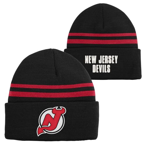 Outerstuff NHL Kids Youth 8-20 Official Cold Weather Striped Cuffed Knit Beanie Hat (US, Alpha, One Size, New Jersey Devils)